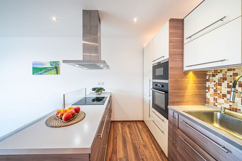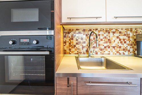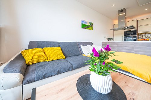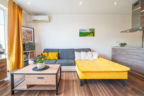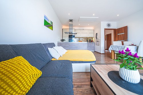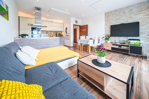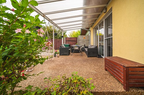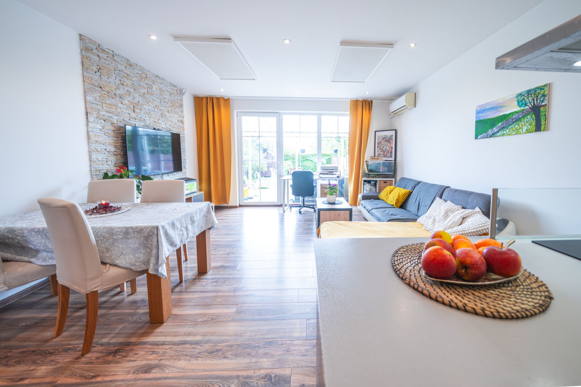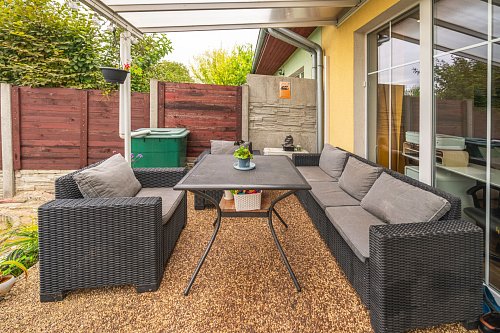 Hlavním prostorem je prostorný obývací pokoj s kuchyňským koutem a jídelní částí, ze kterého je přístup na terasu s pergolou. Dále jsou zde dvě ložnice, koupelna s vanou a sprchovým koutem a samostatná toaleta.